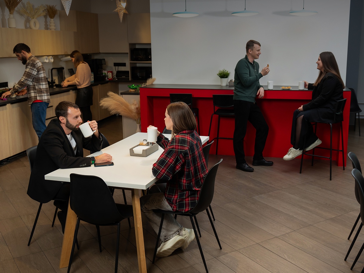 В нашем офисе тебя ждёт удобное и уютное пространство для работы и отдыха в окружении