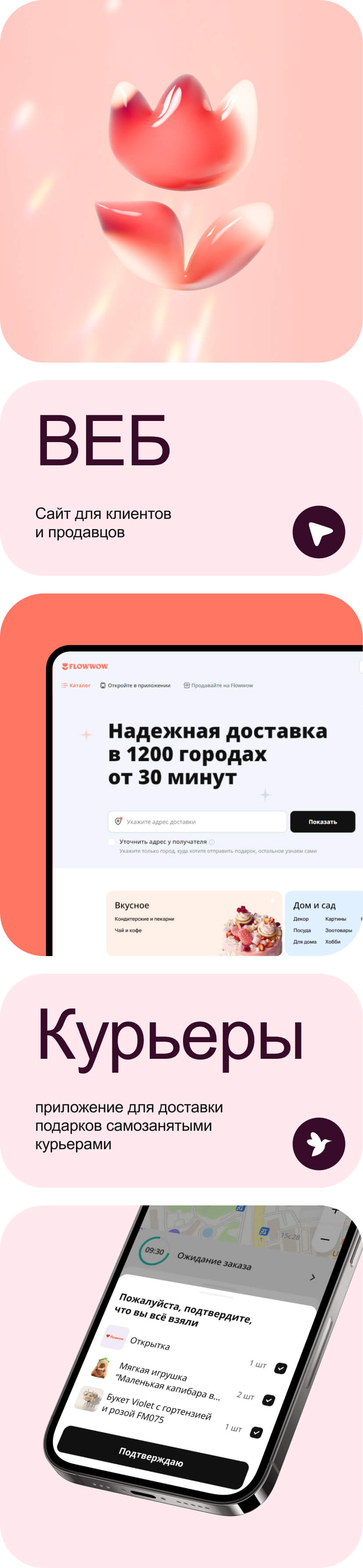Мы создаем экосистему — сайт, приложения для клиентов, продавцов и самозанятых курьеров, чтобы можно было легко выбрать подарок близкому человеку и оформить заказ с быстрой доставкой.