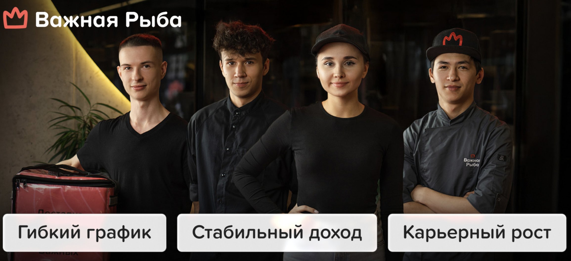 "Важная Рыба" — это не просто ресторан, это команда единомышленников, стремящихся к высоким стандартам и отличным результатам. Мы тщательно подбираем не только продукты, но и людей, которые станут частью нашей семьи!
