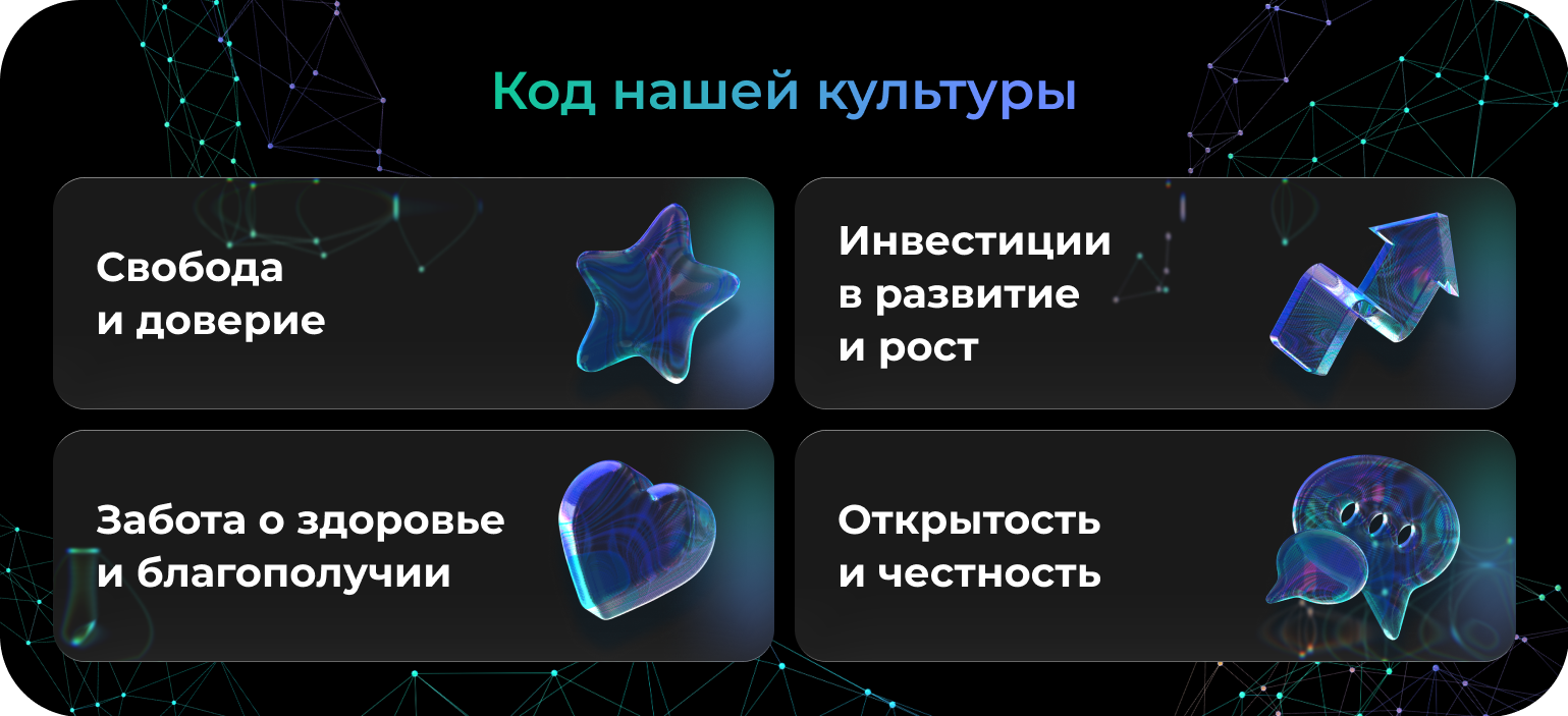 - Заряженную команду экспертов, построенную на профессионализме, человекоцентричности и взаимной поддержке